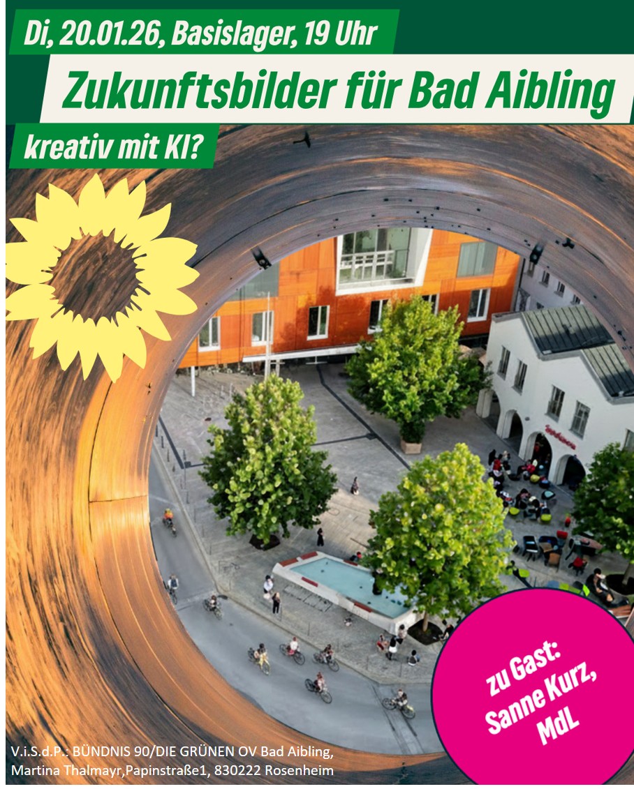 Gemeinsam mit Sanne Kurz, MdL, präsentieren wir erstmals unsere Zukunftsbilder für Bad Aibling – teils gestaltet mit Unterstützung künstlicher Intelligenz. Dazu diskutieren wir Chancen, Grenzen und Auswirkungen von KI auf kreative Prozesse und das Urheberrecht.